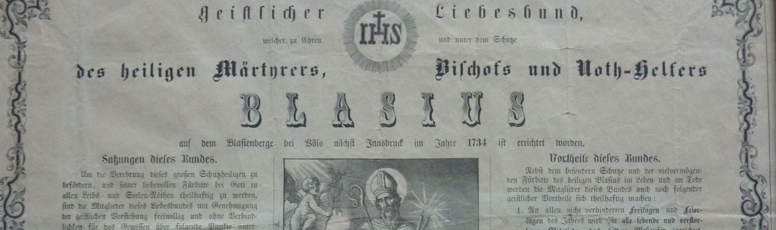„Die Völser „Christoph Mayr, Josef Frantz Fuchs, Peter Rangger, Norbert Rangger Urban Braunegger Mesner zu St. Blasing, samt der ganzen Nachbarschaft zu Völs", sprachen beim Abt Martin Stickler vom Stift Wilten vor, um diesen Bund zu errichten.
