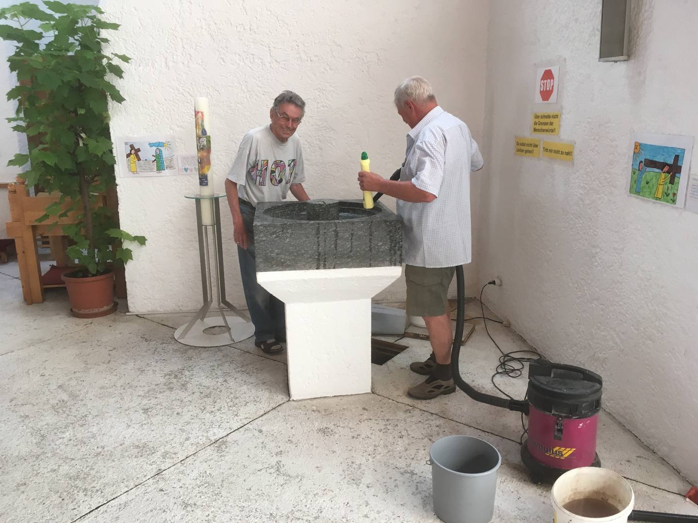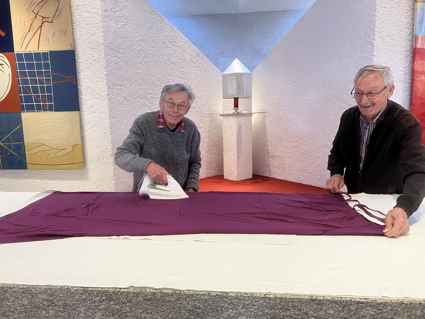 Um diesen Dienst auch entsprechend ausführen zu können, haben sich zwei Frauen, drei Männer und zwei Jugendliche bereit erklärt, sich spirituell und praktisch ausbilden zu lassen. In vorbereitenden Besprechungen übernehmen die einzelnen Mesnerinnen und Mesner verantwortlich und verlässlich die Vor- und Nachbereitung zu den vorgesehenen Gottesdiensten in unserer Pfarrkirche, in der Blasiuskirche, in der Kapelle im Haus der Senioren und in der „Alten Kirche". Weitere Dienste übernehmen zwei Mesnerinnen im Haus der Senioren bei den wöchentlichen Kommunionfeiern für die Heimbewohner sowie beim Öffnen und Schließen und der Betreuung von Heizung und Beleuchtung in der „Alten Kirche" während der Aufbahrung der Verstorbenen. Bei größeren Festen helfen uns bereitwillig auch weitere Frauen und Männer, so beim Aufrichten der Christbäume in der Pfarrkirche, beim Aufstellen des Prozessionsaltars vor der Pfarrkirche und so manch anderen Anlässen. Hiebei werden auch die Vorbereitungen zu größeren Festen, zu Besorgungen unter anderem von Hostien, Kerzen, Weihrauch, Glühlampen sowie zu anfallenden Reparaturen und aktuellen Problemen besprochen. Und unser Pfarrer Christoph motiviert uns anschließend nicht nur mit geistigen Worten sondern auch mit einer guten Jause.